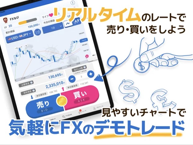 FXなびは、FXに興味があるけど何から勉強したらいいのかわからないという人に優しいアプリで、実際のチャートを使ってゲーム内通貨を使いデモトレードをすることができます。